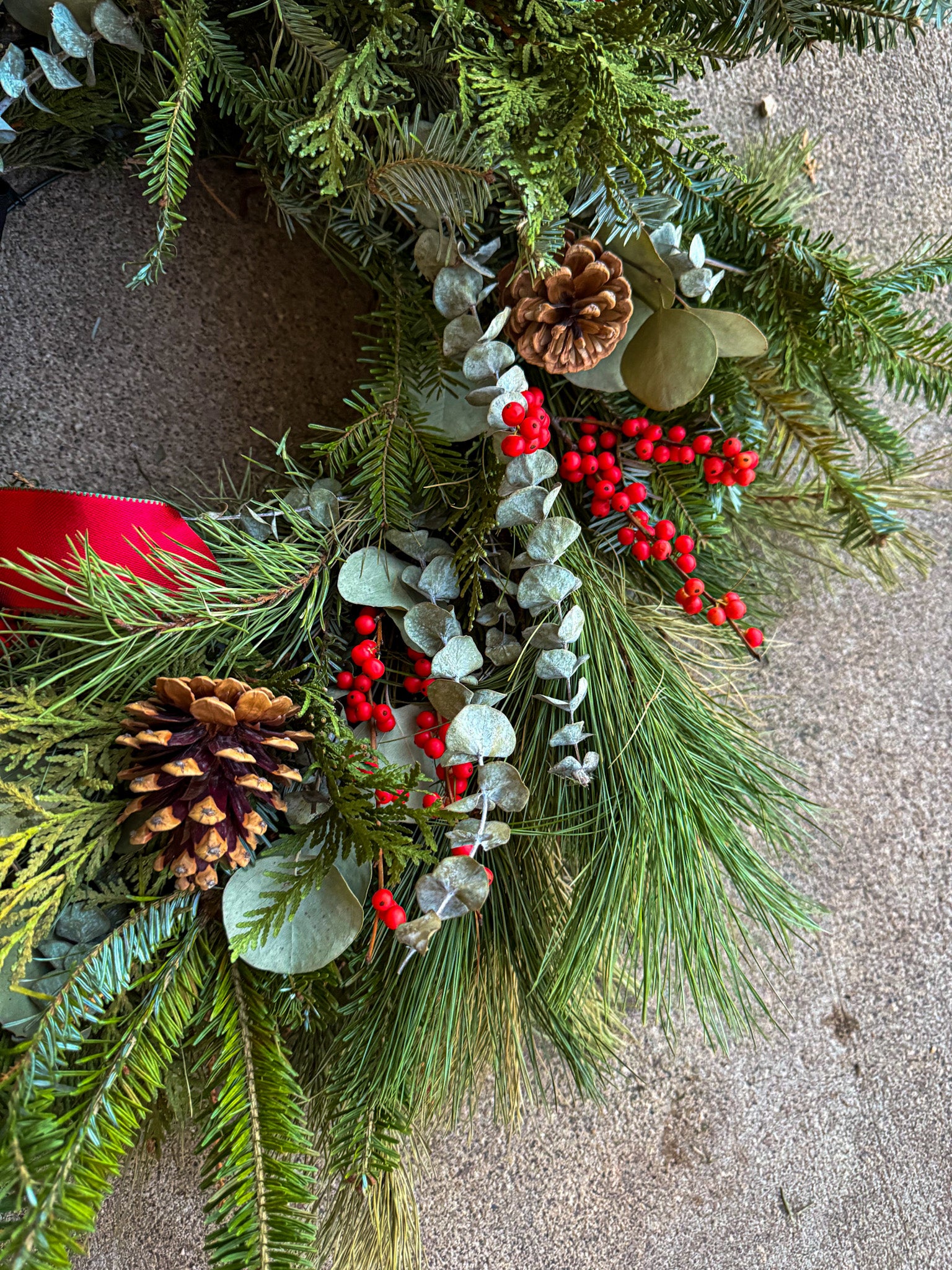 - Materials: Fir, Pine, Cedar, Eucalyptus, Winter Berries, Dried Florals, Pine Cones and Ribbon