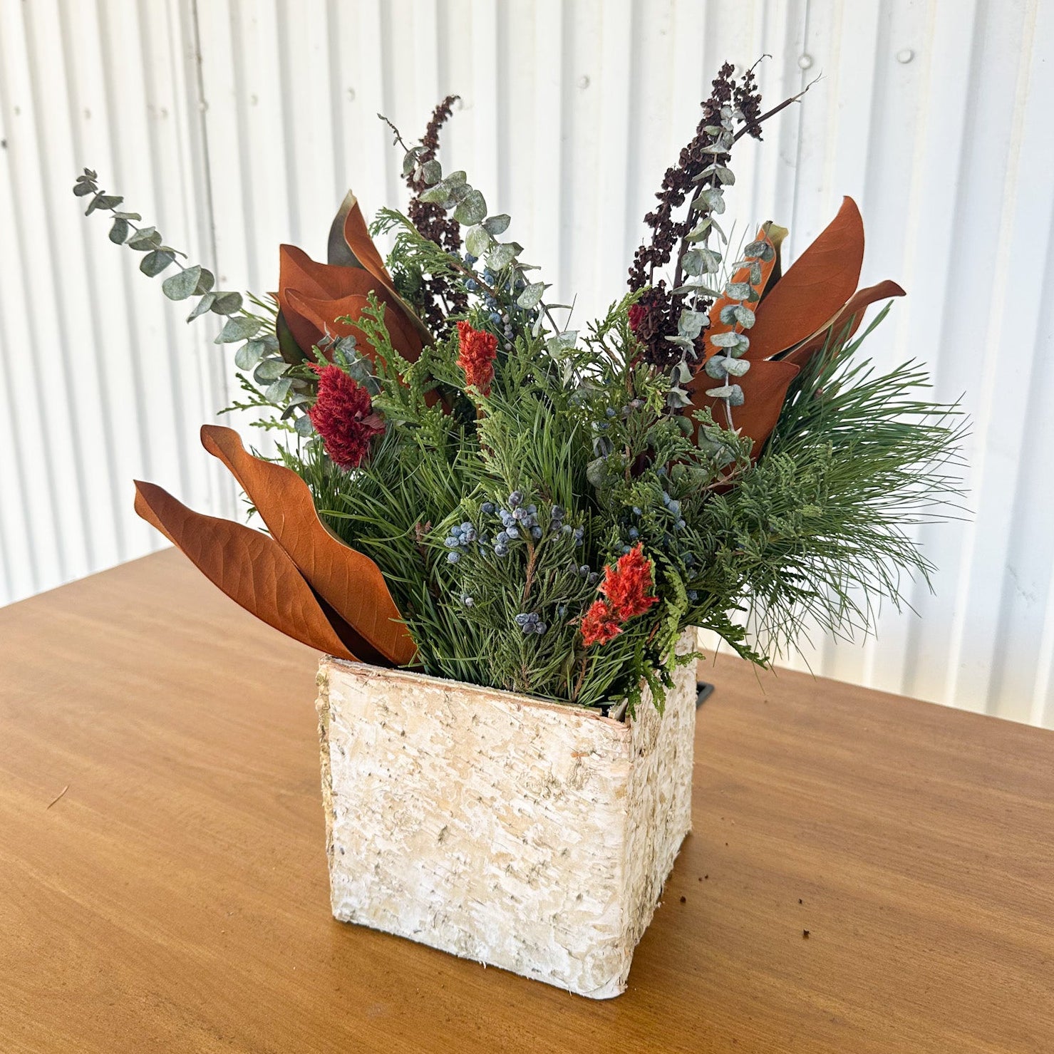 Nestled in a festive container, this handcrafted arrangement features a lush mix of seasonal evergreens harvested from a local tree farm and styled with a variety of natural accents. This arrangement will create a timeless holiday display that is perfect for your dining table, entryway, or as a thoughtful gift. Spread joy, warmth, and the scent of fresh pine this Christmas — one beautiful arrangement at a time!