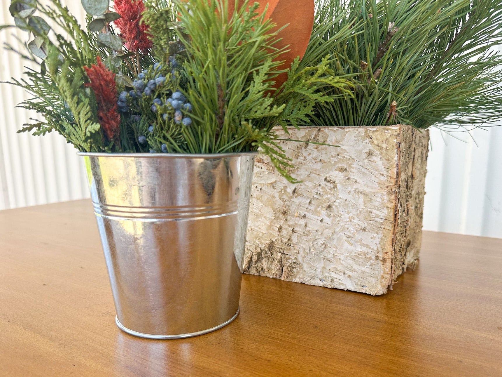 - Merry & Bright: Contains a variety of seasonal greens, red twig dogwood, pine cones, & pops of crimson winter berries.