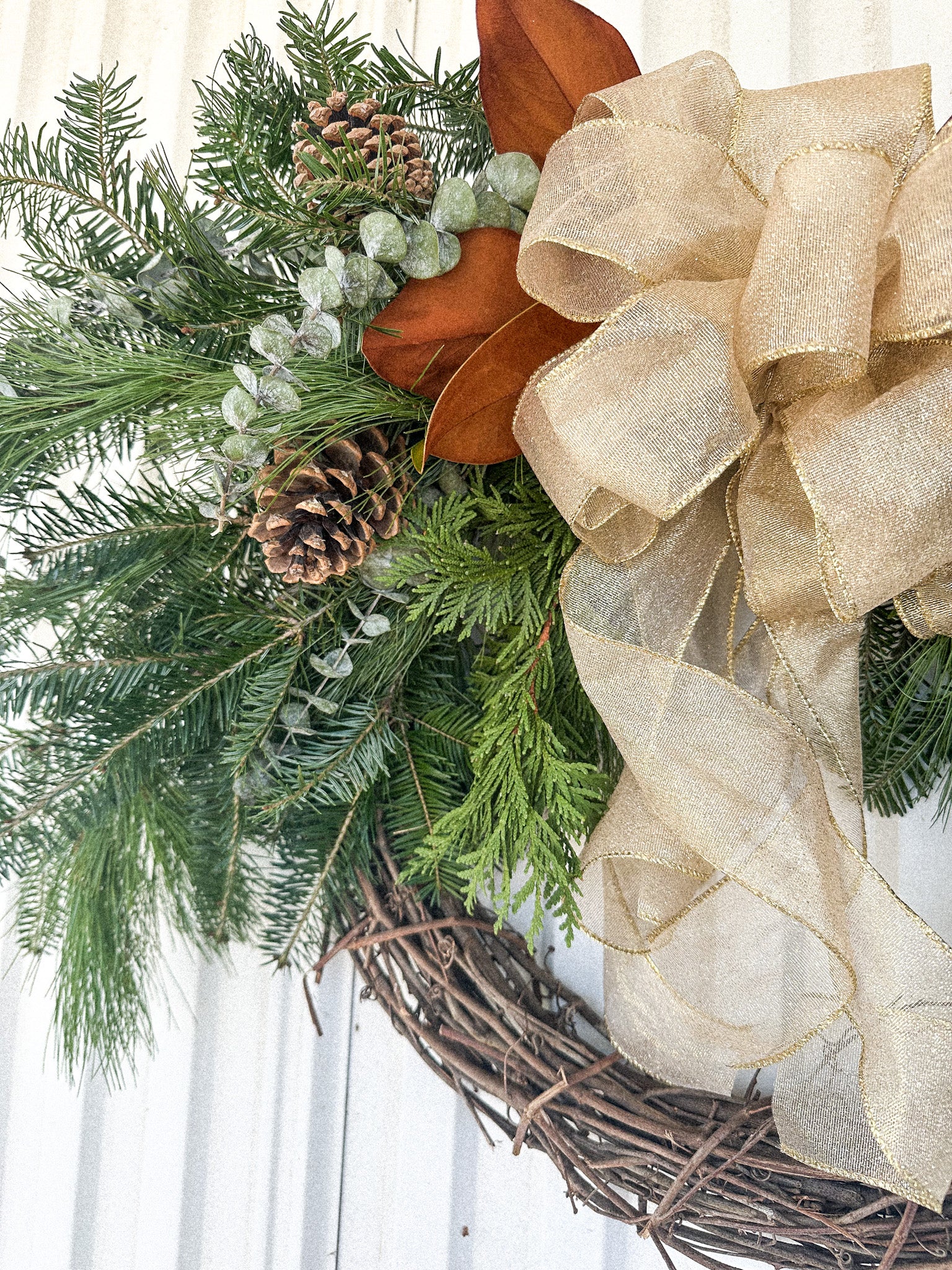 - Materials: Grapevine, Fir, Pine, Cedar, Green & Burgundy Eucalyptus, Pine Cones, Magnolia Leaves, Ribbon